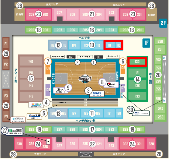 お席は赤枠で囲った1階ホーム側130またはベンチ側111と110の指定席となります。変更はできかねます。