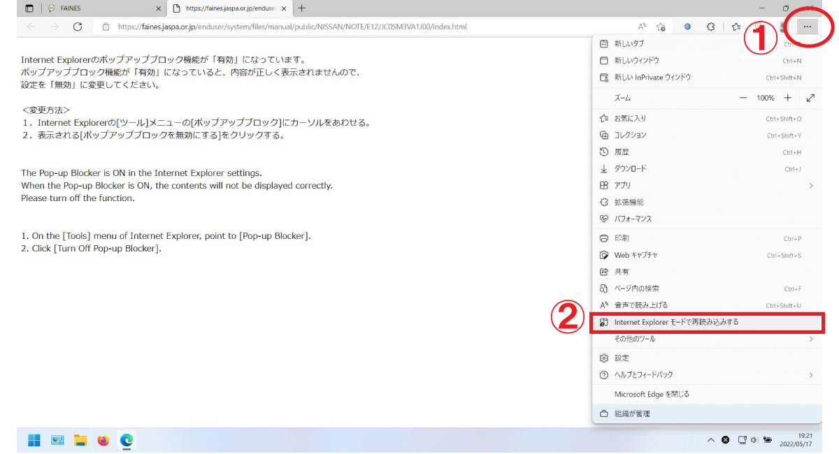 Edgeでの閲覧で問題がある場合は、整備マニュアル情報ページを「Internet Explorerモードで再読み込み」します。IEモードにして画面の表示やページの移動が問題なくできる場合、その整備マニュアルはIEモード(互換表示:無)での表示に対応しています。
